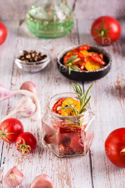 Домашние вяленые помидоры со специями, чесноком и зеленью в банке и свежими овощами. Вертикальный