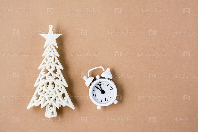 Концепция обратного отсчета в рождественскую ночь. Белый будильник с пяти до двенадцати и декоративная елка на бежевом картоне. Вид сверху. Копировать пространство