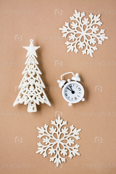 Концепция обратного отсчета в рождественскую ночь. Белый будильник, декоративная елка и снежинки на бежевом картоне. Верхний и вертикальный вид