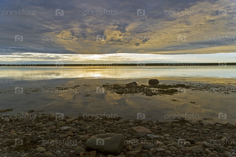Вечер на берегу Белого моря. Солнце светит сквозь облака. Карелия, Россия, конец июня