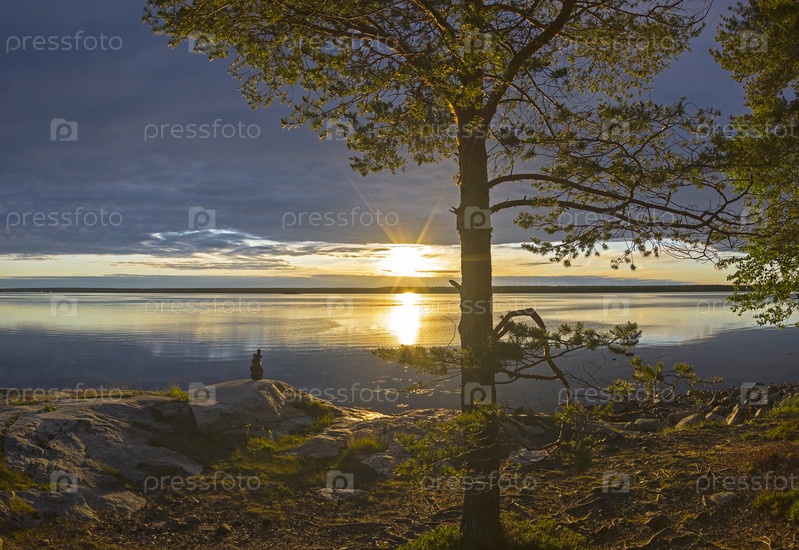 Вечер на берегу Белого моря. Солнце светит сквозь облака. Карелия, Россия, конец июня