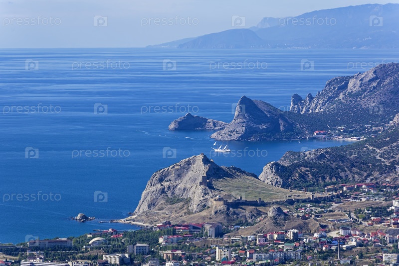 Вид вдоль Крымского побережья в сторону курортного города Судак и Нового Света с вершины горы Ай-Георгий. Солнечный день в сентябре