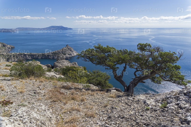 Реликт деревянного можжевельника (Juniperus excelsa) на скале над морем.Новый Свет, Крым, солнечный день в сентябре