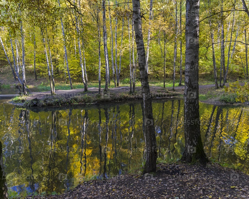 Отражение прибрежных деревьев в водной поверхности. Пруд в ландшафтном заказнике Теплый Стан, Москва, Россия. Солнечный день в октябре