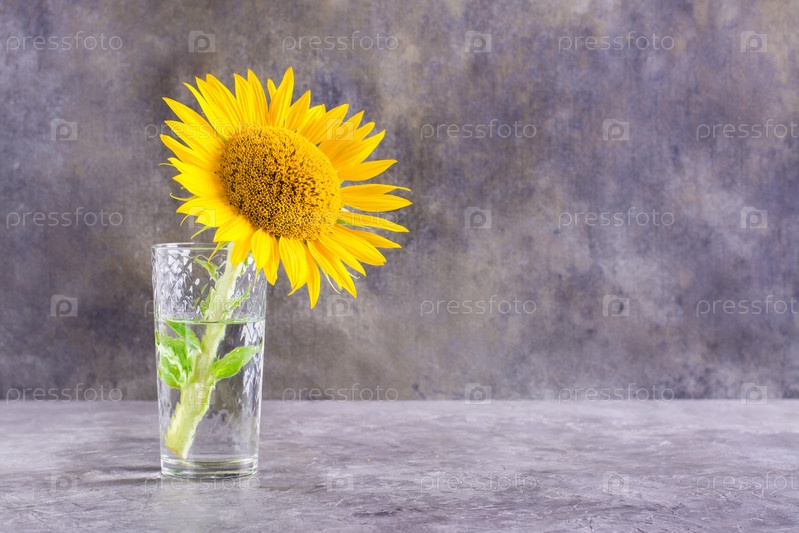 Одинокий молодой подсолнух в стакане на сером столе. Летний натюрморт