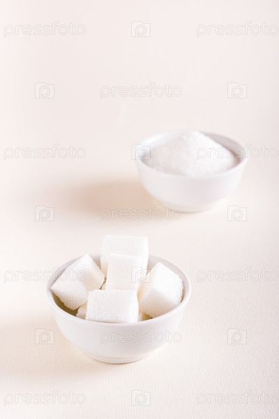 Кубики сахара и сахарный песок в мисках. Выбор между видами сахара. Вертикальный вид