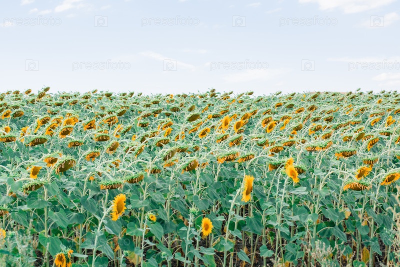 Сельскохозяйственное поле цветущих подсолнухов в летний день. Еда и урожай