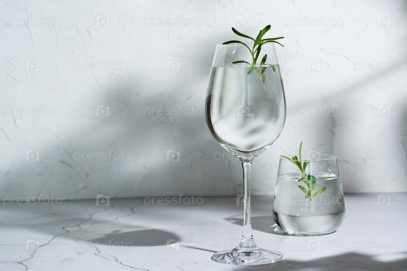 Два стакана с освежающей водой и розмарином на столе в тени листьев деревьев
