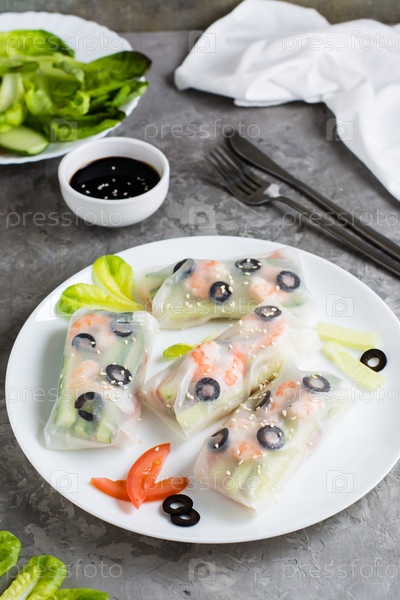 Свежие блинчики с начинкой в рисовой бумаге из креветок, оливок и овощей на тарелке. Вертикальный вид