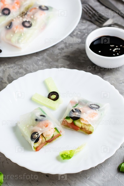 Разрезанный пополам спринг-ролл в рисовой бумаге с морепродуктами и овощами на тарелке. Крупный план по вертикали