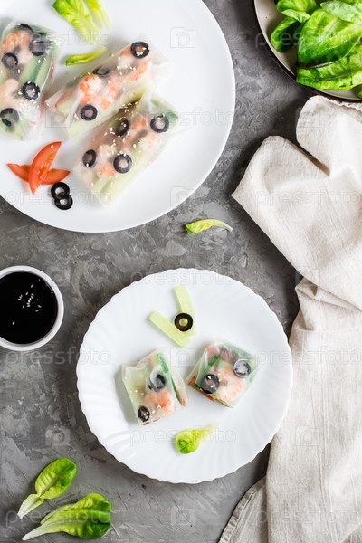 Разрезанный пополам спринг-ролл в рисовой бумаге с морепродуктами и овощами на тарелке. Вертикальный вид сверху
