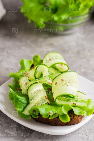 Аппетитная брускетта из ржаного хлеба, салата, огурца и семян льна на тарелке на столе. Здоровое диетическое питание. Вертикальный вид. Крупный план