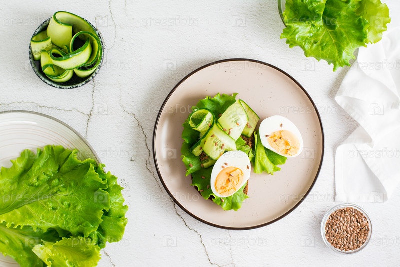 Аппетитная брускетта из ржаного хлеба, салата, огурца, вареного яйца и семян льна на тарелке на столе. Здоровое питание на диете. Вид сверху
