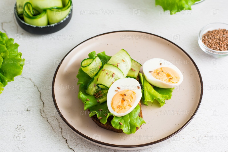 Готовый бутерброд с ржаным хлебом, салатом, огурцом, вареным яйцом и семенами льна на тарелке на столе. Здоровое питание на диете. Крупный план