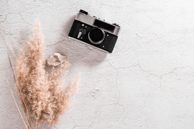 Плоское концептуальное путешествие. Винтажная камера, камень и трава на текстурированном бетонном фоне