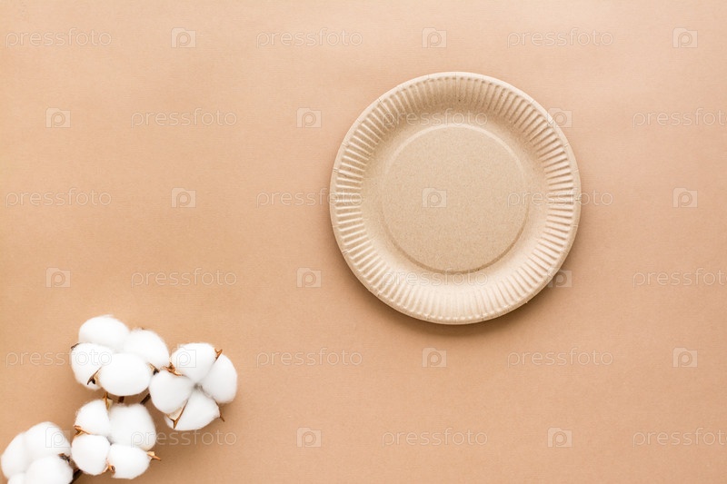 Картонная тарелка и хлопковая ветка на бежевом фоне. Экологически чистая и безотходная концепция. Вид сверху. Копировать пространство