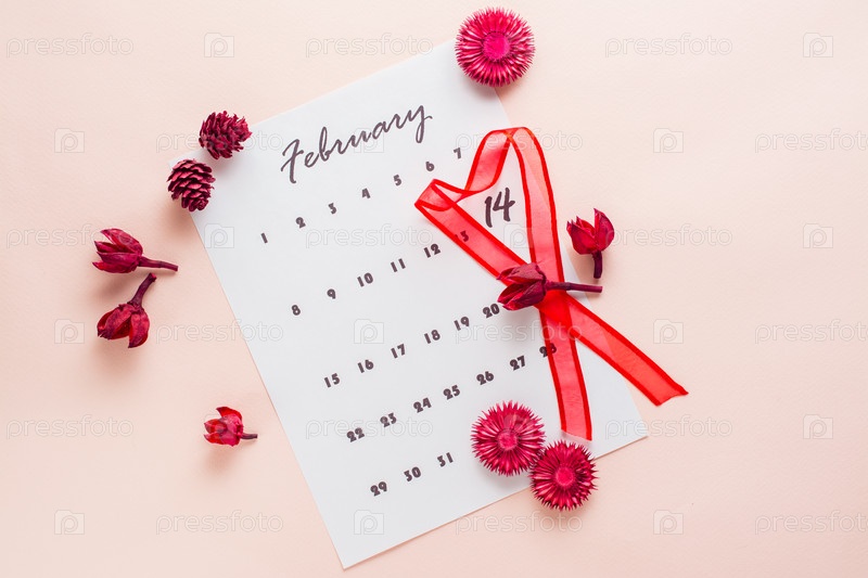 День Святого Валентина. Красная лента в форме сердца подчеркивает дату 14 февраля на листе календаря и сухоцветы на розовом фоне. Вид сверху