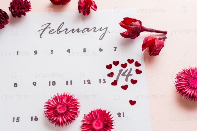 День Святого Валентина. Маленькие красные сердечки выделяют дату 14 февраля на листе календаря и сухие цветы на розовом фоне