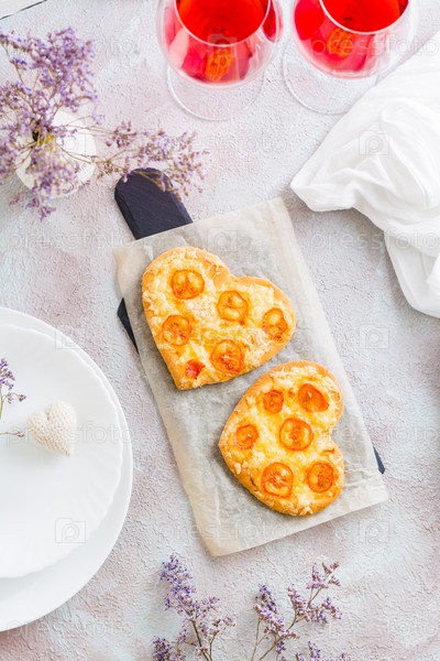Две пиццы в форме сердца на бумаге и два бокала вина на накрытом столе для празднования дня святого валентина. Верхний и вертикальный вид