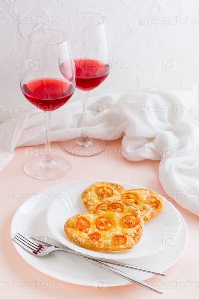 Две вкусные пиццы в форме сердца на тарелках и два бокала вина на накрытом столе в честь дня святого валентина. Вертикальный вид