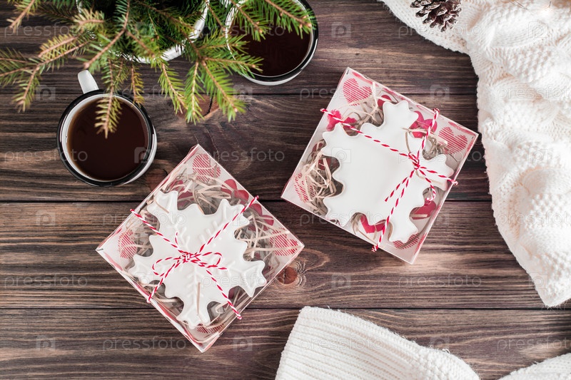 Пряники с глазурью в форме снежинок в коробках и две кружки чая на деревянном столе. Рождественское угощение. Вид сверху
