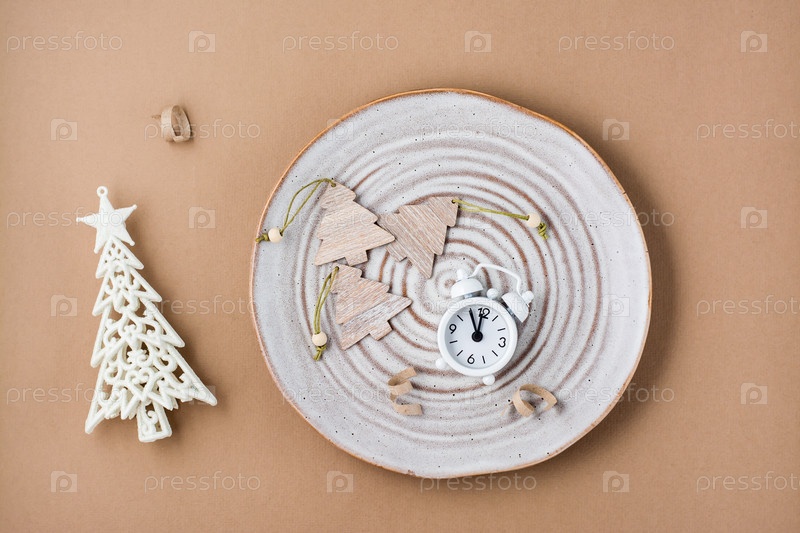 Концепция обратного отсчета в рождественскую ночь. Сервировка стола. Будильник и елки на тарелке на бежевом фоне. Вид сверху