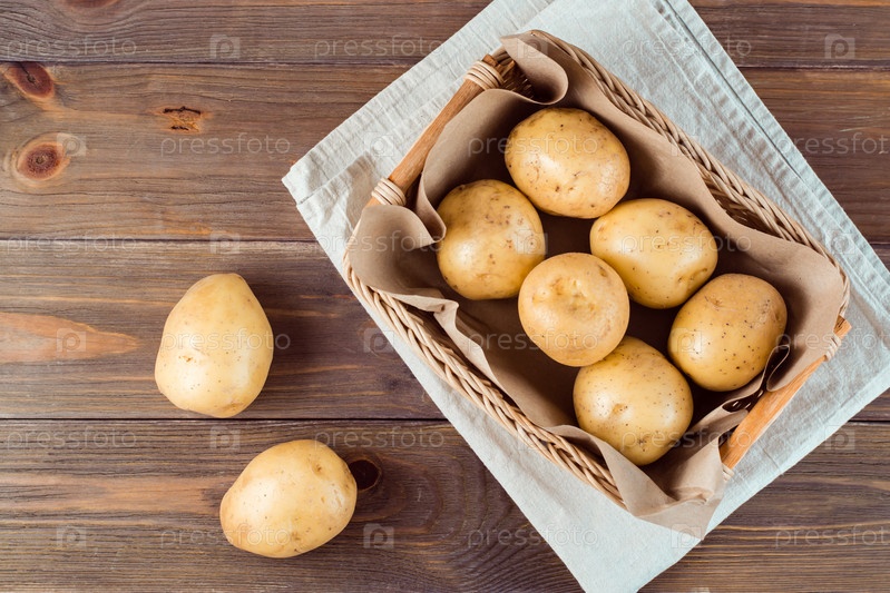 Два клубня свежего желтого картофеля и овощей в корзине и на деревянном столе. Вегетарианская пища. Вид сверху