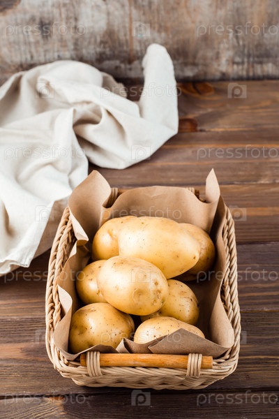 Свежий желтый картофель в корзине и ткани на деревянном фоне. Вегетарианская пища. Вертикальный вид