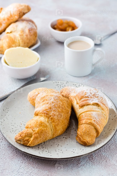Пара свежих хрустящих круассанов на тарелке, чашка кофе и миски с джемом и маслом на светлом текстурированном фоне. Перерыв на кофе или завтрак. Вертикальный вид