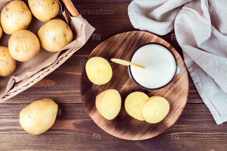 Альтернативное растительное веганское картофельное молоко в стакане и картофельные клубни рядом на деревянном столе. Вегетарианская пища. Вид сверху