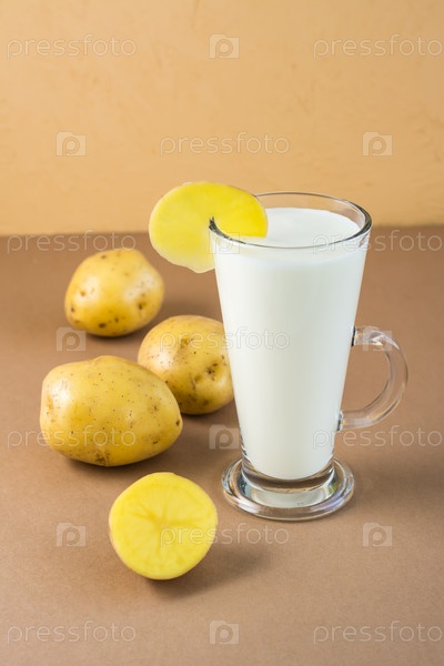 Альтернативное веганское овощное картофельное молоко в стакане и картофельные клубни рядом на коричневом фоне. Вегетарианская и флекситарианская еда. Вертикальный вид