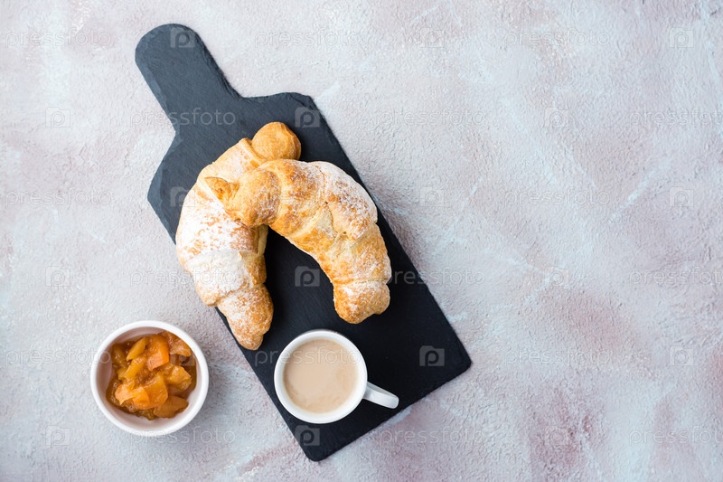 Пара свежих хрустящих круассанов на тарелке, чашка кофе и джем в миске на светлом столе. Перерыв на кофе или завтрак. Вид сверху. Копировать пространство