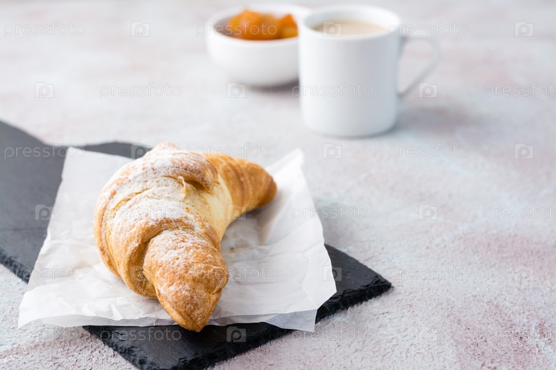 Свежий хрустящий круассан в сахарной пудре на бумаге на доске, чашка кофе и джем в миске на светлом столе. Кофе-брейк или завтрак