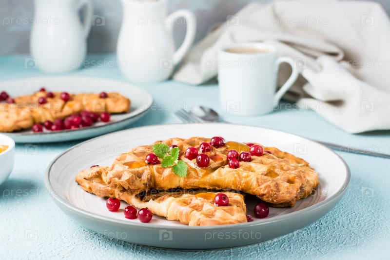 Хрустящие круассаны с красной смородиной, медом и мятой на тарелках и чашкой кофе на светлом столе. Сладкий аппетитный завтрак - крофлы