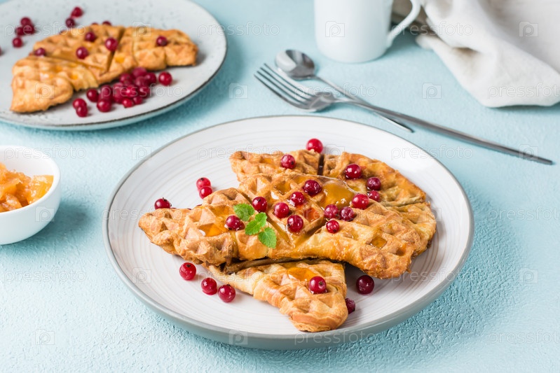 Хрустящие крофлы с красной смородиной, медом и мятой на тарелках и чашкой кофе на светлом столе. Сладкий вкусный завтрак. Крупный план