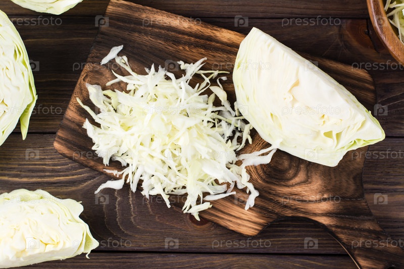 Свежая сырая капуста нарезана полосками на разделочной доске на деревянном столе. Вегетарианская диета. Вид сверху. Крупный план
