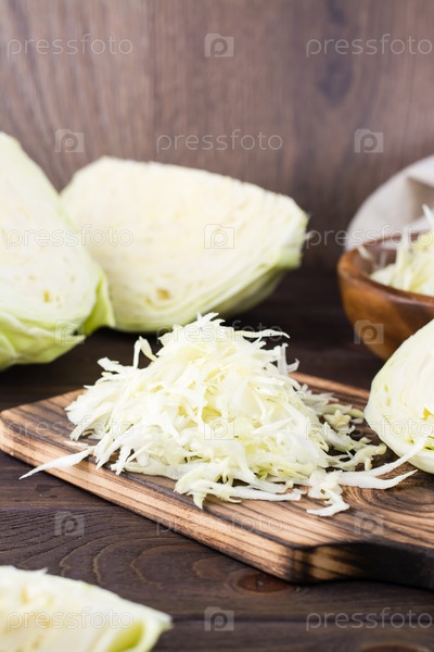 Свежая сырая капуста нарезана полосками на разделочной доске на деревянном столе. Вегетарианская диета. Вертикальный вид. Крупный план
