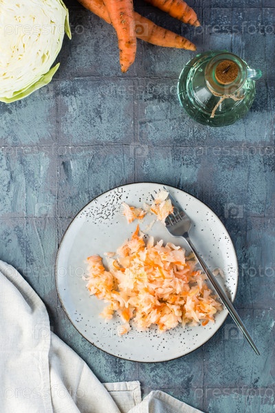Свежая квашеная капуста с морковью и вилкой на тарелке на столе. Ферментация и вегетарианская диета. Вертикальный и вид сверху