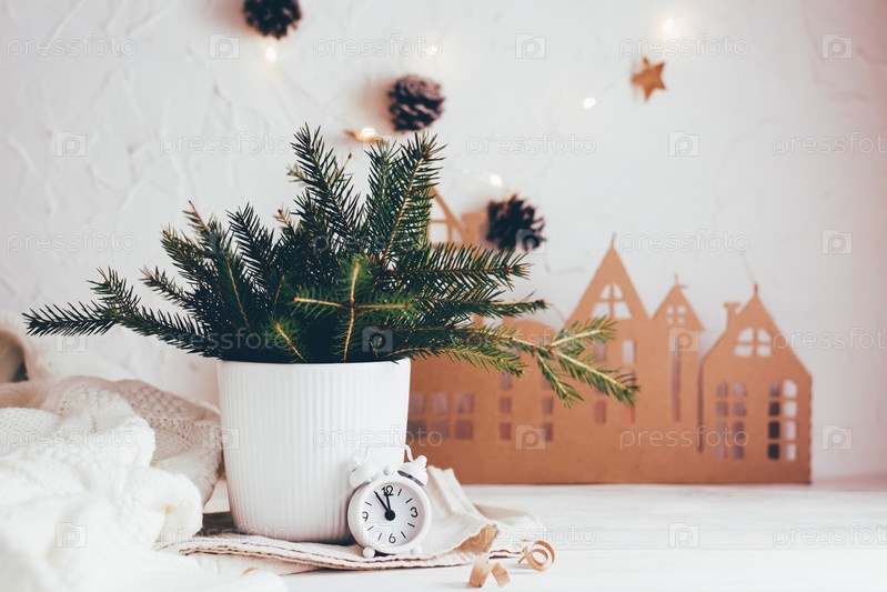 Организация праздничного рождественского стола. Еловый букет в вазе и белый будильник на фоне картонного домика на белом деревянном столе. Экологичный и домашний образ жизни