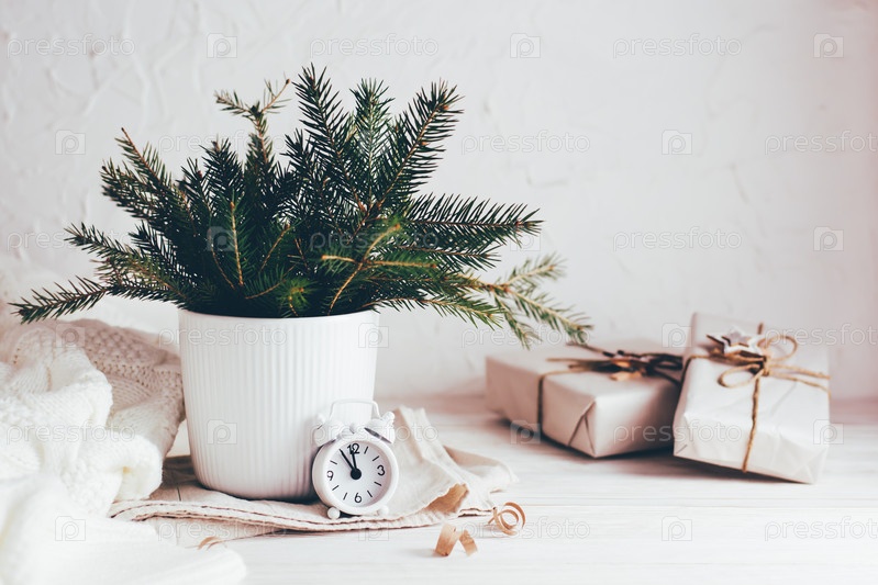 Организация праздничного рождественского стола. Еловый букет в вазе, будильник и рождественские подарки в крафт-бумаге на белом деревянном столе. Экологичный и домашний образ жизни