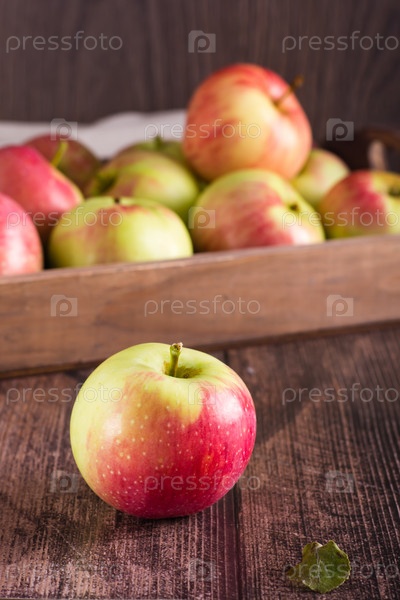 Спелое целое яблоко на фоне коробки с фруктами на деревянном столе. Местные сезонные фрукты. Вертикальный