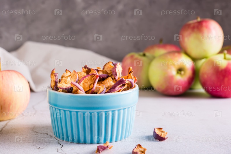 Нарезанные сушеные яблоки в миске и свежие фрукты на столе. Домашняя закуска