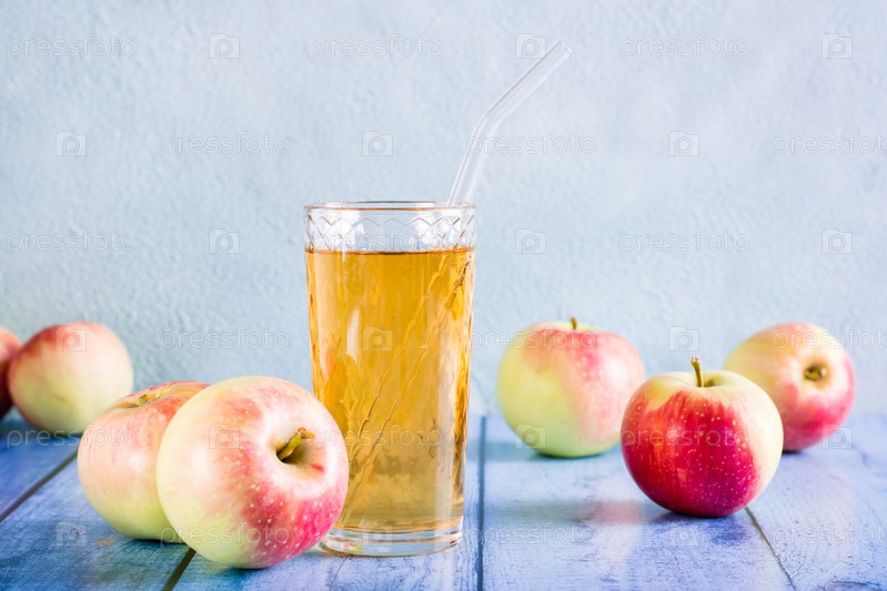 Свежий яблочный сок в стакане и фрукты на столе. Домашние напитки