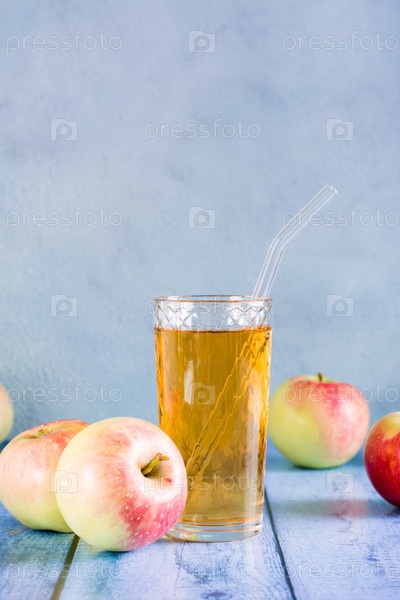 Свежий яблочный сок в стакане и фрукты на столе. Домашние напитки. Вертикальный вид