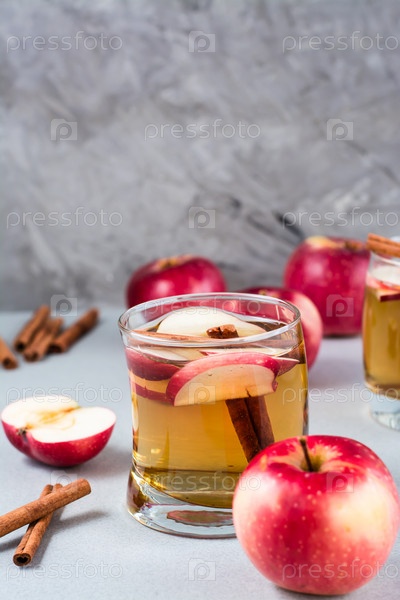 Свежий органический яблочный сидр с корицей в стекле и яблоками на сером фоне. Согревающие зимние напитки. Вертикальный вид. Копировать пространство