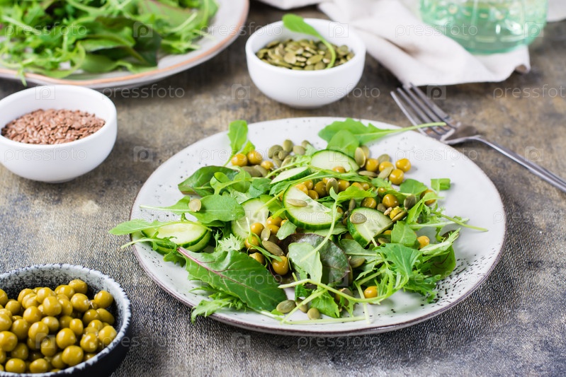 Свежий зеленый салат с огурцом, горохом и рукколой, мизуной и листьями мангольда на тарелке на столе. Витамин и здоровое питание. Вегетарианская и флексетарианская диета