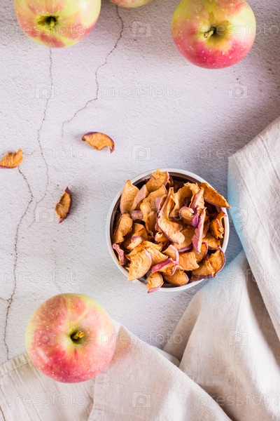 Домашние органические сушеные яблоки в миске и свежие фрукты на столе. Верхний и вертикальный вид