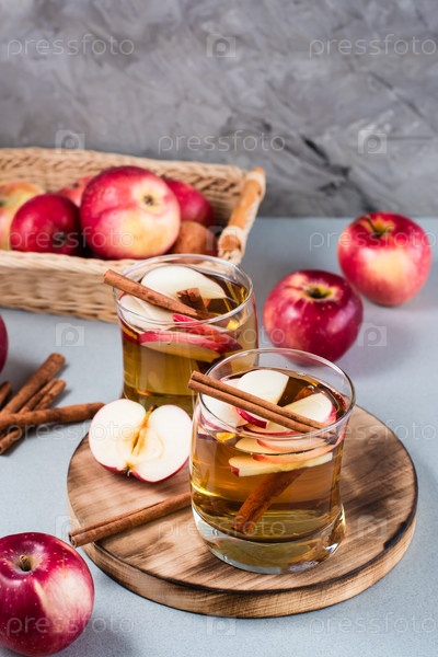 Домашний яблочный сидр с корицей в очках на сером фоне. Согревающие зимние напитки. Вертикальный вид