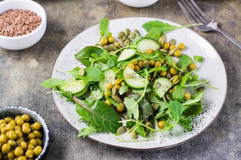 Свежий зеленый салат с огурцом, горохом и рукколой, мизуной и листьями мангольда на тарелке на столе. Витамин и здоровое питание. Вегетарианская и флексетарианская диета. Крупный план