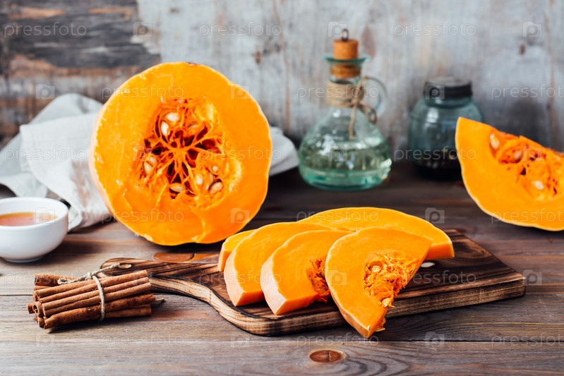 Кусочки со спелыми семенами тыквы на разделочной доске на деревянном столе. Вегетарианская пища. Деревенский стиль